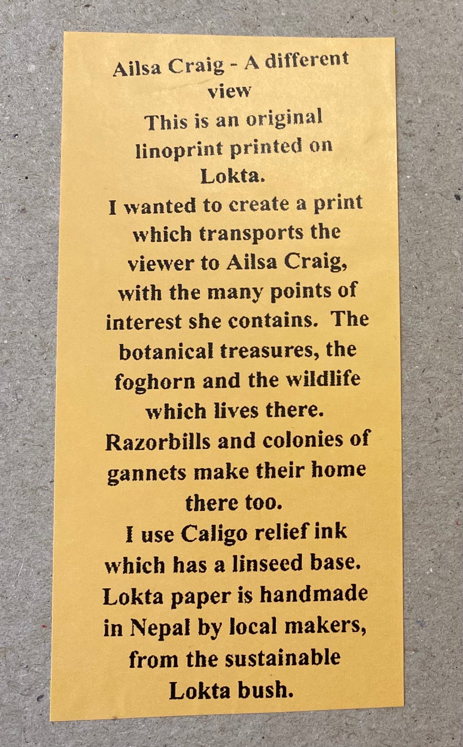A very different representation of this landmark. 'Ailsa Craig - A Different View' is the first of a limited print run of 6, and signed by the artist.. This is a lino print printed on lokta. 44.5cm x 33.5cm.