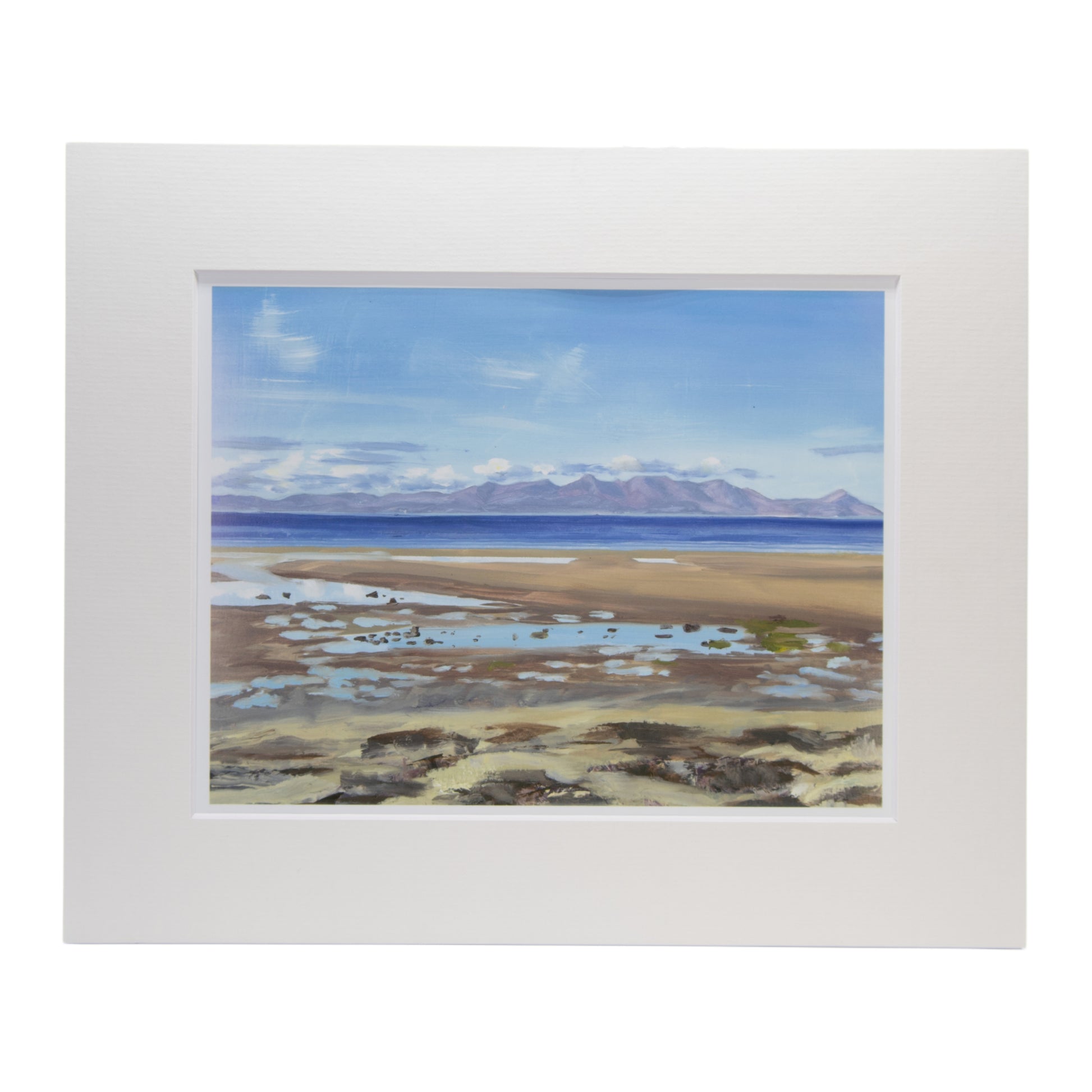 This mounted Arran art print by Crystal Chesters features the peaceful coastal view of Arran from Barassie Beach. Soft blues, sandy tones and shimmering tidal pools lead the eye toward the Isle of Arran on the horizon, capturing the calm, expansive feeling of the Ayrshire shoreline on a clear day.